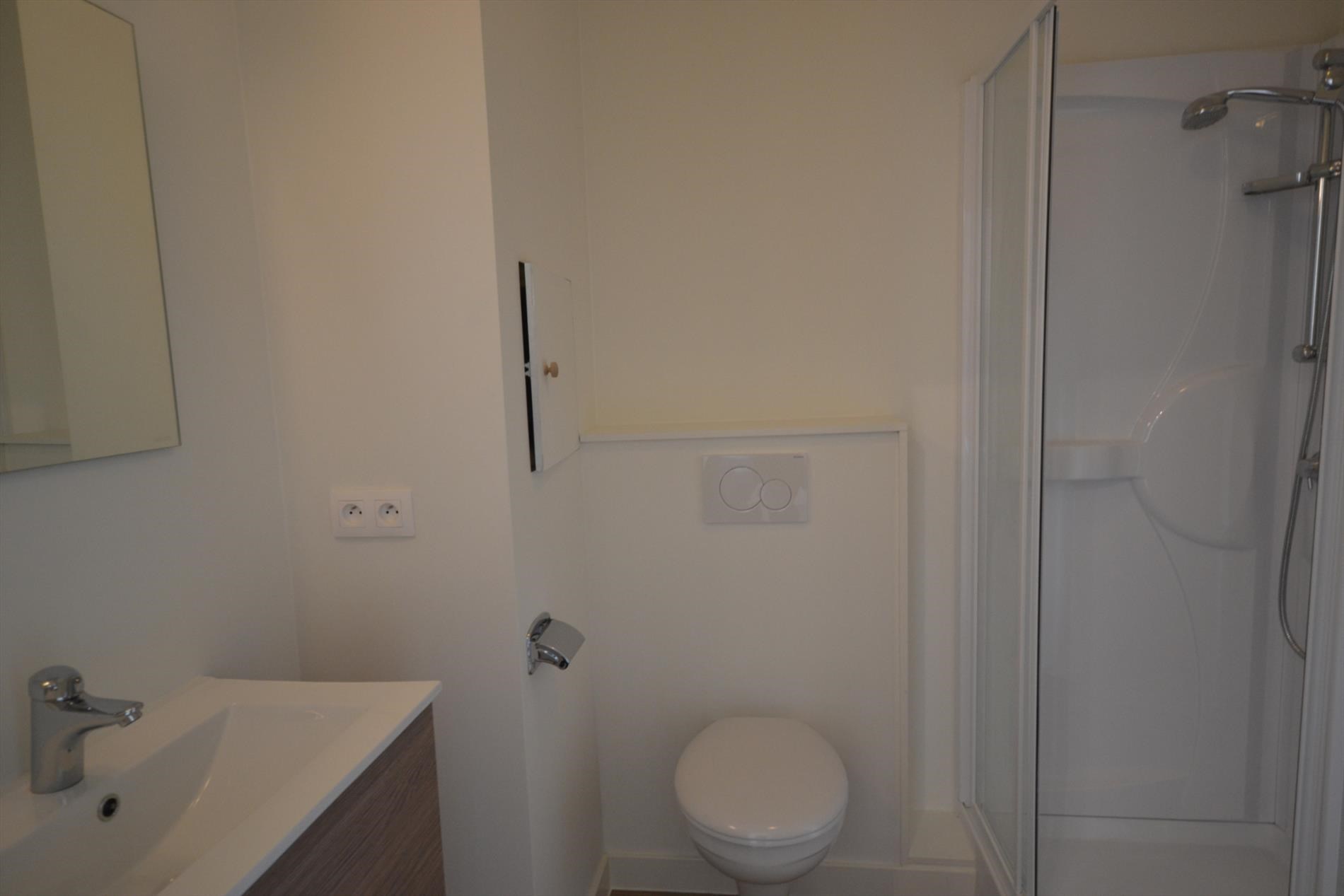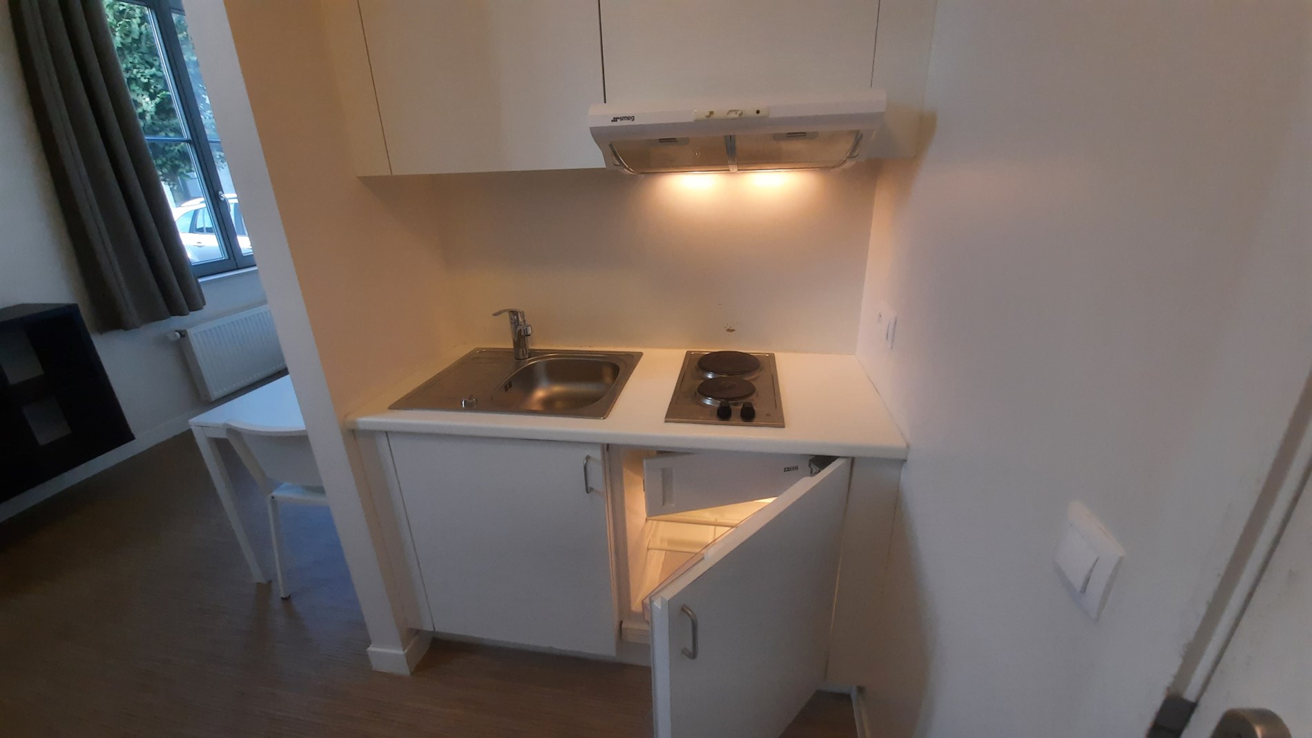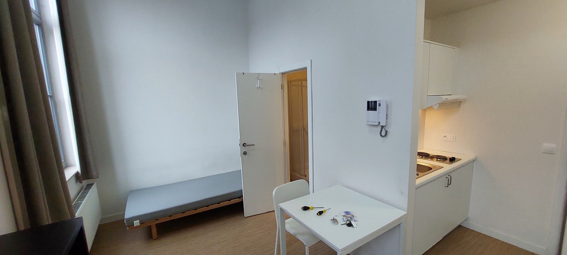 Mooi uitgeruste studenten studio met eigen sanitair en open keuken.